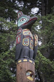 The totem poles of the Pacific Northwestern Indigenous peoples of North America are carved, monumental poles featuring many different designs (bears, birds, frogs, people, and various supernatural beings and aquatic creatures). They serve multiple purposes in the communities that make them. Similar to other forms of heraldry, they may function as crests of families or chiefs, recount stories owned by those families or chiefs, or commemorate special occasions.[4][5] These stories are known to be read from the bottom of the pole to the top.