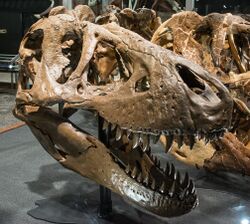 This specimen, considered the most complete of any Tyrannosaurus specimen at more than 98% preservation,[122] was discovered in Montana in 2006. Following years of unsuccessful attempts to sell it to museums or auction it off, the North Carolina Museum of Natural Sciences started negotiations in 2016, which were prolonged due to a legal battle over the rights to the fossil, which was resolved in 2020. The fossils are set to be displayed by the NC Museum in 2023.[123] The Dueling Dinosaurs T. rex is an adolescent that was preserved entangled with a Triceratops. Given the injuries present on both fossils, it has been theorized that both died while fighting one another. The specimen has not yet been properly studied due to its recent acquisition to science. However, important biological data is likely preserved with the specimen, including body outlines, skin impressions, soft tissues, injuries, stomach contents, and even original proteins.[124][125]