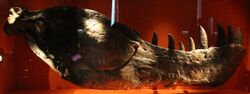 Commercial paleontologist Craig Pfister discovered the specimen in the lower Hell Creek Formation in Carter County, Montana, in 2010.[88][89] Its excavation and preservation lasted four years.[89] It was later sold to Danish-born investment banker Niels Nielsen, who loaned the specimen to the Museum für Naturkunde in Berlin, Germany, for research and exhibition.[90] It has been on display at Museum für Naturkunde between 2015 and 2020,[89] moving to the Natural History Museum of Denmark for one year, and expected back in 2021.[91][92] Nielsen and his friend Jens Jensen named the specimen Tristan-Otto (short: Tristan) for their sons.[93] The Museum für Naturkunde Berlin lists it under specimen number MB.R.91216.[94] Several European museums have Tyrannosaurus casts (replicas) or parts, but Tristan is one of only two original skeletons on display in the continent (the other is "Trix" in the Netherlands).[88] The matte-black fossilised skeleton is about 12 m (39 ft) long and 3.4 m (11 ft) tall at the hips.[95][96] Tristan is among the most complete known Tyrannosaurus skeletons: It was re-assembled from about 300 separate parts, 170 of which are original (including 98% of the skull and all the teeth), the rest reproductions.[89][90][95] It is estimated to have died when about 20 years old and it was in poor health, having several bone fractures, bite marks to the skull and signs of disease in the jaw.[88][95] The disease present in Tristan's jaw was suggested to be a case of tumefactive osteomyelitis.[97]