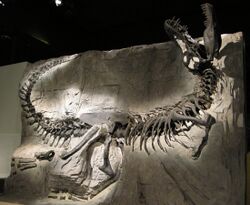Osborn planned to mount the similarly sized AMNH 5027 and AMNH 973 together in dynamic poses.[11] Designed by E.S. Christman, the scene was to depict a rearing Tyrannosaurus (AMNH 5027) snapping at another cowering one (AMNH 973), as they fought over the remains of a hadrosaur, described at the time as Trachodon. However, technical difficulties prevented the mount from being executed. One obvious problem was that the Cretaceous Dinosaur Hall was too small to accommodate this dramatic display, and AMNH 5027 was already mounted by itself as the central attraction of the hall. The forearms of Tyrannosaurus were not well documented and the hands were unknown, so for the sake of the display, the forearms of AMNH 5027 were given three fingers, based on the forelimbs of Allosaurus (the more allosaur-like arms were replaced several years later when better fossils of tyrannosaurid arms were found).