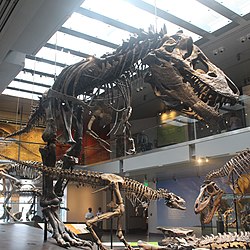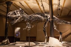 The fossils of Montana's T. rex are exhibited at Museum of the Rockies as part of a full skeletal mount completed with cast elements replacing the missing bones.[56] This mount was installed after the Wankel Rex (now nicknamed The Nation's T. rex) was loaned to the Smithsonian to occupy a central part in the museum's dinosaur hall, featuring a dynamic mount showing the apex predator devouring a Triceratops carcass.[57][58] It has been stated by Pete Makovicky, the Chicago museum's lead curator of dinosaurs, that this specimen is in the same size range as "Sue" and "Scotty".[59]