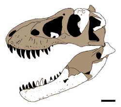A small but nearly complete skull of Nanotyrannus lancensis, frequently considered to be a juvenile T. rex, was recovered from Montana in 1942. This skull, Cleveland Museum of Natural History (CMNH) 7541, measures 60 centimeters (2.0 ft) in length and was originally classified as a species of Gorgosaurus (G. lancensis) by Charles W. Gilmore in 1946.[12] In 1988, the specimen was re-described by Robert T. Bakker, Phil Currie, and Michael Williams, then the curator of paleontology at the Cleveland Museum of Natural History, where the original specimen was housed and is now on display. Their initial research indicated that the skull bones were fused, and that it therefore represented an adult specimen. In light of this, Bakker and colleagues assigned the skull to a new genus, named Nanotyrannus for its apparently small adult size. The specimen is estimated to have been around 5.2 meters (17 ft) long when it died.[13] However, a detailed analysis of the specimen by Thomas Carr in 1999 showed that the specimen was, in fact, a juvenile, leading Carr and many other paleontologists to consider it a juvenile specimen of T. rex.[14] The current classification of CMNH 7541 is not universal,[15] with some research suggesting the specimen belongs to a taxon distinct from Tyrannosaurus.[16]