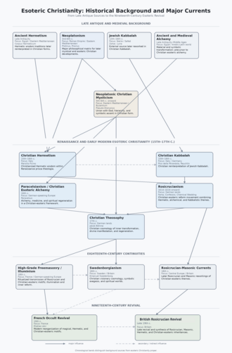 Synoptic chart of the historical background and major currents of esoteric Christianity. Esoteric Christianity properly emerged during the Renaissance; the theory of prisca theologia, present in sectors of the humanist movement, favored the Christian reinterpretation of platonism, hermeticism, alchemy, and kabbalah. However, the esoteric Christianity that reached the contemporary era was mediated by the Romantic movement of the late 18th century and 19th century; Romantic sensibility revalued the imagination, the forces of nature, and the symbolic world—in a context of declining esotericism in the face of Enlightenment trends and scientific revolutions—thus fostering the cultural climate of the subsequent 19th century occult revival.