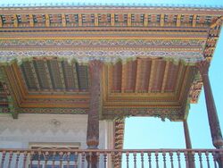 Around 20 km south, in the village of Chorku, the mausoleum Hazrati Shoh Mausoleum, is carved from wood, partly dating back to the 8th century,[5] a structure that is unique in Central Asia.
