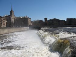 Between the southeast part of the city of Narva and the rest, facing the Russian city of Ivangorod, the Narva flows over the Baltic Klint, forming Narva Waterfall, once among the most powerful in Europe.[1] Before the water reaches the falls it is split into two branches by the Kreenholm island, thus the falls consist of two sections. Kreenholm Falls, west of the island, is 60 m wide and 6.5 m high with multiple terraces. Joala Falls, to the east, is 110 m wide and up to 6.5 m high. The Estonian–Russian border follows the eastern branch and goes through Joala Falls.[1]