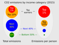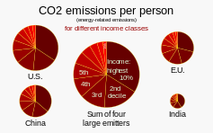 Though total CO 2 emissions (size of pie charts) differ substantially among high-emitting regions, the pattern of higher income classes emitting more than lower income classes is consistent across regions.[34] The world’s top 1% of emitters emit over 1000 times more than the bottom 1%.[34]