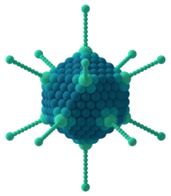 1) Icosahedral- An icosahedron is a polyhedron with 12 vertices and 20 faces. Two types of capsomeres constitute the icosahedral capsid: pentagonal (pentons) at the vertices and hexagonal (hexons) at the faces. There are always twelve pentons, but the number of hexons varies among virus groups. In electron micrographs, capsomeres are recognized as regularly spaced rings with a central hole. [2]