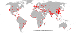 In 1950, around the world, 764 million people lived in urban areas. By 2014, it was 3.9 billion. The change was driven by a combination of increased total population and increased percent of population living in urban areas.[3] In 2009, the number of people living in urban areas (3.42 billion) surpassed the number living in rural areas (3.41 billion), and since then the world has become more urban than rural.[4] This was the first time that the majority of the world's population lived in a city.[5] In 2014 there were 7.3 billion people living on the planet,[6] of which the global urban population comprised 3.9 billion. The Population Division of the United Nations Department of Economic and Social Affairs at that time predicted the urban population would occupy 68% of the world population by 2050, with 90% of that growth coming from Africa and Asia.[7]