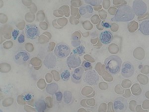 The peripheral blood and bone marrow aspirate findings in copper deficiency can mimic myelodysplastic syndrome.[8] Bone marrow aspirate in both conditions may show dysplasia of blood cell precursors and the presence of ring sideroblasts (erythroblasts containing multiple iron granules around the nucleus). Unlike most cases of myelodysplastic syndrome, the bone marrow aspirate in copper deficiency characteristically shows cytoplasmic vacuoles within red and white cell precursors, and karyotyping in cases of copper deficiency does not reveal cytogenetic features characteristic of myelodysplastic syndrome.[6][7]