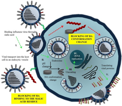 Mechanisms of inhibition of virus entry by peptides (viral entry can be blocked via interaction of peptide with hemagglutinin, commonly interacting with residue of sialic acid)[1]