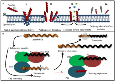 a)Most common interactions between antiviral peptides with an influenza virus lipid bilayer b)image shows polymerase assembly in virus replication cycle; antiviral peptides may bind to PB2 subunit and prevent the assembly of influenza polymerase complex[1]