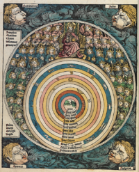 Genesis 1–2 reflects ancient ideas about science: in the words of E.A. Speiser, "on the subject of creation biblical tradition aligned itself with the traditional tenets of Babylonian science."[99] The opening words of Genesis 1, "In the beginning God created the heavens and the earth", sum up the author(s) belief that Yahweh, the god of Israel, was solely responsible for creation and had no rivals.[100] Later Jewish thinkers, adopting ideas from Greek philosophy, concluded that God's Wisdom, Word and Spirit penetrated all things and gave them unity.[101] Christianity in turn adopted these ideas and identified Jesus with the creative word: "In the beginning was the Word, and the Word was with God, and the Word was God" (John 1:1).[102] When the Jews came into contact with Greek thought, there followed a major reinterpretation of the underlying cosmology of the Genesis narrative. The biblical authors conceived the cosmos as a flat disc-shaped Earth in the centre, an underworld for the dead below, and heaven above.[103] Below the Earth were the "waters of chaos", the cosmic sea, home to mythic monsters defeated and slain by God; in Exodus 20:4, God warns against making an image "of anything that is in the waters under the earth".[100] There were also waters above the Earth, and so the raqia (firmament), a solid bowl, was necessary to keep them from flooding the world.[104] During the Hellenistic period this was largely replaced by a more "scientific" model as imagined by Greek philosophers, according to which the Earth was a sphere at the centre of concentric shells of celestial spheres containing the Sun, Moon, stars and planets.[103]