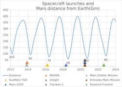 The planet Mars has been explored remotely by spacecraft. Probes sent from Earth, beginning in the late 20th century, have yielded a large increase in knowledge about the Martian system, focused primarily on understanding its geology and habitability potential.[1][2] Engineering interplanetary journeys is complicated and the exploration of Mars has experienced a high failure rate, especially the early attempts. Roughly sixty percent of all spacecraft destined for Mars failed before completing their missions, with some failing before their observations could even begin. Some missions have been met with unexpected success, such as the twin Mars Exploration Rovers, Spirit and Opportunity, which operated for years beyond their specification.[3]