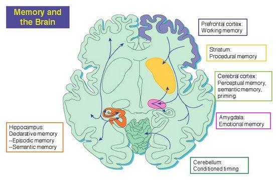 Whereas H.M. and amnesic patients can be severely impaired in declarative memory, they typically retain various forms of implicit memory, which involves the ability to acquire skills, habits, and preferences that can be expressed by improved performance or altered bias without conscious recollection (Schacter, 1987). These various forms of implicit memory are supported by a variety of memory systems and within the cerebral cortex, as in the case of priming introduced above. One implicit memory system involves cortical areas interacting with the striatum in support of procedural memory, the acquisition of skilled behavior and acquired habits. Procedural memories are expressed directly through activation of the brain’s motor coordination system (Packard & Knowlton, 2002). Additionally, memory involving fine precision of timing in motor learning depends on the cerebellum (Krupa et al., 1993). Another distinct memory system involves cortical and subcortical areas interacting with the amygdala to support the attachment of affective significance to otherwise neutral stimuli and events. This system expresses emotional memory by activating the hypothalamus and sympathetic nervous system, which generate emotional reactions and feelings (LeDoux, 1996). Thus, in addition to the declarative memory system, the procedural and emotional memory systems can store and distinctly express different forms of memory even for the same event.