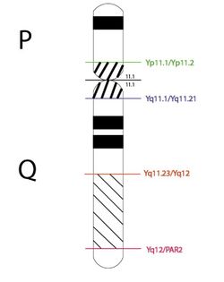 The male-specific region of the Y chromosome contains a mosaic of heterochromatic sequences. In addition, it also made up of three classes of euchromatic sequence, which are the ampliconic genes, X-transposed, and X-degenerate. It has also been shown that an additional euchromatic sequence exists for the Yq11 region of the Y chromosome. These regions are all primarily interchromosomal. There are also three additional euchromatin/heterochromatin transition regions for a total of four on the Y chromosome. Together, these are Yp11.2/Yp11.1, Yq11.1/Yq11.21, Yq11.23/Yq12, and Yq12/PAR2. Of these four regions, the Yq11.23/Yq12 region is unique in its structure as it is composed of recurrent TPTE and SLC25A15 duplicons which have originated from different long arms regions of chromosome 13. Furthermore, the Yp11.2/Yp11.1 and Yq11.1/Yq11.21 regions contain the more ancient duplications and are predominantly located in the subtelomeric regions. Nowadays, these duplications prefer to map to the pericentromeric regions in the modern human and chimpanzee. There has been a shift from the subtelomeric regions of the Old World monkeys to the pericentromeric regions of the modern primate. This evolutionary change coincides with the shortening of the subtelomeric regions as well as the development of higher-order alpha-satellites. [8]