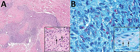 The novel bacterium was discovered in 2008 following the autopsy of 2 deceased patients from Mexico.[8] Similar to its close relative, Mycobacterium leprae, M. lepromatosis is a facultative intracellular parasite, able to reproduce in and outside of host cells, a fact that researchers have speculated is why bacterial culturing in the laboratory has been unsuccessful.[9] Visually indistinguishable from its close relative, M. leprae, M. lepromatosis is an aerobic bacillus, requiring an oxygenated environment, is rod-shaped, consistent with all bacillus bacteria, and is resistant to acids due to the presence of mycolic acids in the cell wall.[4] This prohibits the standard use of the Gram stain in characterization.