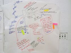 Clustering is often used to define and understand the basic thematics of the topic (such as 'danger,' as seen in the image).[citation needed] What follows is approximately 10–15 minutes of clustering and writing of anything and everything that comes to mind—whether related or unrelated and opposing or supporting. Next, to move forward and solidify group understanding, a voting process is used to identify the most thought-provoking or applicable statements about each basic thematic; finally, the group shares and discusses observations. The critical caveat of the writing and voting portion is that they both are performed silently, unjudging, divergently and done with confidence that every contribution is critical.[4]
