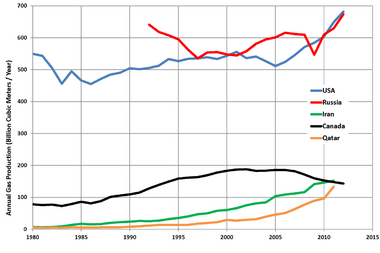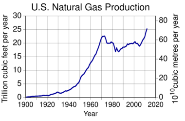 Shale gas is natural gas produced from shale. Because shale's matrix permeability is too low to allow gas to flow in economical quantities, shale gas wells depend on fractures to allow the gas to flow. Early shale gas wells depended on natural fractures through which gas flowed; almost all shale gas wells today require fractures artificially created by hydraulic fracturing. Since 2000, shale gas has become a major source of natural gas in the United States and Canada.[45] Because of increased shale gas production the United States was in 2014 the number one natural gas producer in the world.[46] The production of shale gas in the United States has been described as a "shale gas revolution" and as "one of the landmark events in the 21st century."[47]