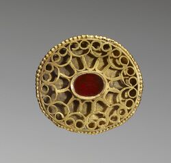 Both ancient sources and archaeological finds from graves confirm that the Huns wore elaborately decorated golden or gold-plated diadems.[11] Maenchen-Helfen lists a total of six known Hunnish diadems.[12] Hunnic women seem to have worn necklaces and bracelets of mostly imported beads of various materials as well.[13] They are also known to have possessed small mirrors of an originally Chinese type, which often appear to have been intentionally broken when placed into a grave.[14] Archaeological finds indicate that the Huns wore gold plaques as ornaments on their clothing, as well as imported glass beads.[15]