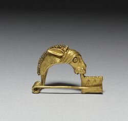 Jewelry and weapons attributed to the Huns are often decorated in a polychrome, cloisonné style.[7] Archaeologist Joachim Werner argued that the Huns developed a unique "Danubian" style of art that combined Asiatic goldsmithing techniques with the enormous amount of gold given as tribute to the Huns by the Romans; this style then influenced European art.[8] In the 1970s, A. K. Ambroz argued that the polychrome style originated with the Huns; however, more recent archaeological discoveries show that it predates their arrival in Europe.[9] Warwick Ball, moreover, argues that the decorated artifacts of the Hunnish period were probably made by local craftsmen for the Huns rather than by the Huns themselves.[10]