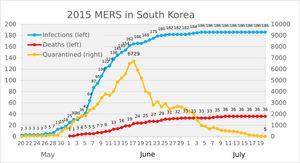 As of 27 June 2015, 19 people in South Korea have died from this outbreak, with 184 confirmed cases of infection.[81] There have been at least 6508 quarantined.[82][83][84][85][86][87][excessive citations]