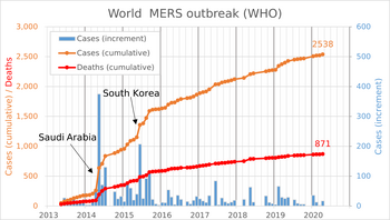 The first case was identified in June 2012 by Egyptian physician Ali Mohamed Zaki at the Dr. Soliman Fakeeh Hospital in Jeddah, Saudi Arabia, and most cases have occurred in the Arabian Peninsula.[1][6] Over 2,600 cases have been reported as of January 2021, including 45 cases in the year 2020.[3] About 35% of those who are diagnosed with the disease die from it.[1] Larger outbreaks have occurred in South Korea in 2015 and in Saudi Arabia in 2018.[7][1]