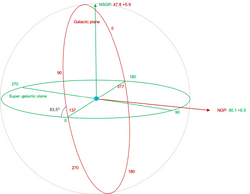 In the 1950s the astronomer Gérard de Vaucouleurs recognized the existence of a flattened “local supercluster” from the Shapley-Ames Catalog in the environment of the Milky Way. He noticed that when one plots nearby galaxies in 3D, they lie more or less on a plane. A flattened distribution of nebulae had earlier been noted by William Herschel. Vera Rubin had also identified the supergalactic plane in the 1950s, but her data remained unpublished.[1] The plane delineated by various galaxies defined in 1976 the equator of the supergalactic coordinate system de Vaucouleurs developed. In years thereafter with more observation data available de Vaucouleurs' and Rubin's findings about the existence of the plane proved right.