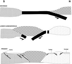 The Tian Shan contains two late Paleozoic sutures.[3] The older, southern suture marks the collision of a passive margin at the north of the Tarim block and an active continental margin; subduction under the latter was to the north.[3] The late Paleozoic continent-continent collision along Tarim's northern margin created an orogenic belt along the southern part of the Tian Shan.[5] The younger, northern suture separates a northern Carboniferous island arc from an active continental margin developed over a south-dipping subduction zone.[3]