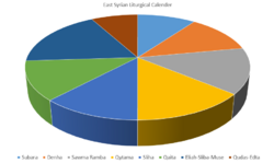 The Liturgical Calendar of the East Syriac Rite is fixed according to the flow of salvation history. With a focus upon the historical life of Jesus Christ, believers are led to the eschatological fulfillment (i.e. the heavenly bliss) through this special arrangement of liturgical seasons.[10] The liturgical year is divided into 8 seasons of approximately 7 weeks each but adjusted to fit the solar calendar. The arrangement of the Seasons in the Liturgical Year is based on seven central events on celebrations of the Salvation History. They are: