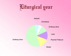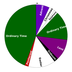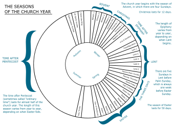 The liturgical year, also called the church year, Christian year or kalendar,[1][2] consists of the cycle of liturgical seasons in Christian churches that determines when feast days, including celebrations of saints, are to be observed, and which portions of Scripture are to be read either in an annual cycle or in a cycle of several years.[3]