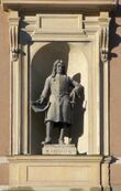 The western row, or the western facade, represents "The Male Qualities" and the King. From the western row projects the Chancery Wing towards northwest. The row also abuts the Outer Courtyard and the two curved wings, Högvaktsflygeln in the north and the Kommendantsflygeln in the south. On the facade are nine medallions depicting nine Swedish regents and ten caryatids.[49] The central window above the portal is where the King and the Royal Family usually appears on the Kings birthday.[50]