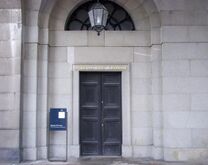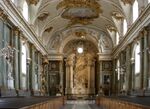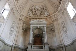 The Royal Chapel was built during the 18th century and it is the parish church for the members of the Royal Parish. The church is situated in the east half of the southern row of the palace. It is as wide as the building and two and a half stories high. The entrance of the church is in the South Portal (or Arch) at the address Slottsbacken 1. Service is held every Sunday and holy day, and the Royal Family use the church for ceremonies. Before the old Tre Kronor castle burned down, the Royal Chapel was in the northern row, some benches and silver decorations from the old church are still preserved in the chapel.[84] After fire in 1697, when Tessin planned the new palace, the Royal Chapel and the Hall of State were placed in the southern row and these, including the grand stairs, occupies the first and second floor. The chapel represented the divine power and the hall the worldly, or the king's, power. After Tessin's death, his work was completed by Carl Hårleman. The church was inaugurated at the same time as the rest of the palace in 1754.[85]