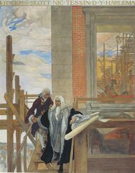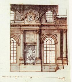 After the fire, the Regency Council of King Charles XII under the direction of the Queen dowager Hedvig Eleonora of Holstein-Gottorp at the Karlberg Palace that a new castle should be built on the walls of the burnt castle. Nicodemus Tessin the Younger was the architect appointed to draw and build the new Stockholm Palace.[6] At the same time that Tessin's plans were approved, he was appointed head of the construction of the palace as part of his new position: Överintendent över de Kungliga Slotten (Superintendent of the Royal Castles), a kind of castle architect. Göran Josuæ Törnquist (later ennobled Adelcrantz) became the Assisting intendent and his deputy, an important position at the construction site, and Hans Conradt Buchegger became general contractor for the palace construction. In 1697, Abraham Winantz Svanssköld, Tessin's half brother, was appointed deputy castle and court architect. Together with Tessin he was active at the palace construction and they were helped by several German journeymen.[16] Important sculptors and craftsmen during the first years of the construction were, among others, René Chauveau, Bernard Foucquet the Elder and his son Jacques Foucquet.[17]