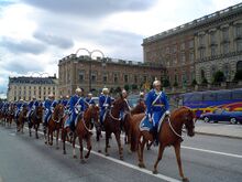 The palace has two courtyards. Outside the western row is the Outer Courtyard which is the main area for the changing of the guards. A statue of Christina Gyllenstierna stands in the Outer Courtyard, erected at an initiative from the Föreningen för Stockholms fasta försvar (The Society for the Permanent Defence of Stockholm) in 1912.[45] The Outer Courtyard is enclosed by two curved wings. The northern is used by the Royal Guards and the southern mainly by the Royal Gift Shop.[46]