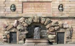From the eastern facade, two wing projects towards the east. On the short sides of these are two waterfalls and head sculptures of the artists who created the interior of the palace; Pierre Hubert L'Archevêque and Carl Hårleman on the north side, Carl Gustaf Tessin and Guillaume Thomas Taraval on the south side.[49] These sculptures were made by Johan Axel Wetterlund in 1902, and are made of bronze. Between the sculptures there are two plaques honoring King Oscar II on the south side and Charles XII on the north side.[51]