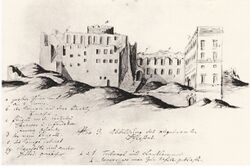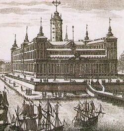 A map of the Stadsholmen from the 1650s, illustrates de la Vallées suggestion for the conversion of the old castle. The project also brought about an adjustment of the Slottsbacken, making it partially enclosed by buildings. Of interest are Tessin the Younger's additions in pencil on that map, probably made at the end of the 17th century. There is an early sketch for the northern facade's west wing and the two curved wings enclosing the outer courtyard (both executed). Tessin the Younger also made plans for the city area west of the palace with large stairs in false perspective where the Axel Oxenstierna palace, among other buildings, are and joining the Västerlånggatan in addition to a wide street to the present Mynttorget, straight though the city block with the present Brantingtorget (not executed). He had envisioned a line of sight from the center of the palace, westwards to the Riddarholmen.[5]