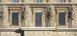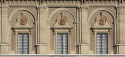 Over the windows of the ground floor are 16 reliefs made in 1699 to 1700, by the French artist René Chauveau. They are made of bronze, and were originally to be placed in the palace's stairwells. In the 1890s, the reliefs were mounted on the southern facade, where they replaced a row of windows of the same size. The corresponding windows still exist on the northern facade.[32]