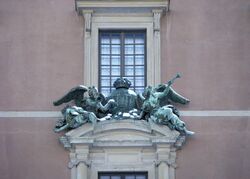 The Kungamedaljongerna (the Royal Medallions) above the windows are made by Cousin. The medallions depict Gustav I, Eric XIV, John III, Sigismund III, Charles IX, Gustavus Adolphus, Queen Christina, Charles X Gustav, Charles XI. The medallions are approximately 1.5 m (4.9 ft) in diameter and were made of lead in 1745.[51]