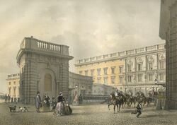 When Tessin got the commission to design the new palace, he abandoned parts of his earlier plan about building a square palace and added the lower wings flanking the palace in the east and west.[6]
