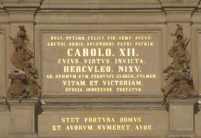 At the triumphal arch there is a stone plaque with writing in Latin. The plaque is flanked by two sculptures depicting war trophies. They were created in 1735, by Antoine Bellette and cast by Gerhard Meyer the Younger. The inscription on the plaque honoring King Charles XII says: