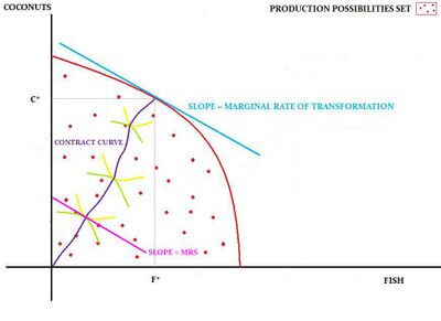 From the figure 8, it is clear that an economy operating at a position where the MRS of either Crusoe or Friday is not equal to the MRT between coconuts and fish cannot be Pareto efficient. This is because the rate at which, say Friday is willing to trade coconuts for fish is different from the rate at which coconuts can be transformed into fish. Thus, there is a way to make Friday better off by rearranging the production pattern.[1]