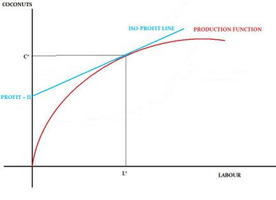 The above function describes iso-profit lines (the locus of combinations between labour and coconuts that produce a constant profit of Π). Profits can be maximised when the marginal product of labour equals the wage rate (marginal cost of production).[7] Symbolically,
