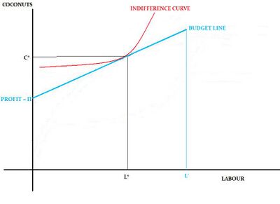 Note that labour is assumed to be a 'bad', i.e., a commodity that a consumer doesn't like. Its presence in his consumption basket lowers the utility he derives.[1] On the other hand, coconuts are goods. This is why the indifference curves are positively sloped. The maximum amount of labour is indicated by L'. The distance from L' to the chosen supply of labour (L*) gives Crusoe's demand for leisure.
