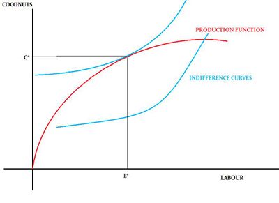 Crusoe's indifference curves depict his preferences for leisure and coconuts while the production function depicts the technological relationship between how much he works and how many coconuts he gathers. If the axes depicting coconut collection and leisure are reversed and plotted with Crusoe's indifference map and production function,[1] figure 2 can be drawn: