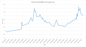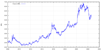 Jair Bolsonaro's tenure, initially welcomed with enthusiasm by the financial markets, started with US$1=Template:BRL. Fueled by meager results of the economy, quick disenchantment followed, resulting in lack of foreign investments and real's strong depreciation.[4] On 13 May 2020, during the COVID-19 pandemic, which deeply affected Brazil,[5] the real reached a historical low against the US dollar, being negotiated at US$1=Template:BRL.[6]