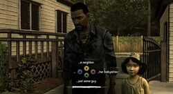Some parts of the game require timed responses from the player, often leading to significant decisions that will impact the game's story, in the manner of role-playing games (RPGs).[9] Some conversation trees require the player to make a selection within a limited time, otherwise Lee will remain quiet, which can affect how other characters respond to him. Unlike in other RPGs such as the Mass Effect or Fallout series, where choices fall on either side of a "good or evil" scale, the choices within The Walking Dead have ambiguous results, having an effect on the attitude of the non-player characters towards Lee.[9] The player can opt to enable a "choice notification" feature, in which the game's interface indicates that a character has changed their disposition towards Lee as a result of these choices.[10] In more action-based sequences, the player must follow on-screen prompts for quick time events (QTEs) so as to keep themselves or other characters alive. If the player dies, the game restarts from just prior to the QTE. Other timed situations involve major decisions, such as choosing which of two characters to keep alive.