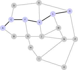 Example ACFKLQ routing through an idealized mesh network of payment channels.
