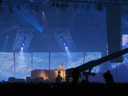 The entire idea of what could be done with LED was given an early shake up by Mark Fisher's design for U2's PopMart Tour of 1997. He realized that with long viewing distances, wide pixel spacing could be used to achieve very large images, especially if viewed at night. The system had to be suitable for touring so an open mesh arrangement that could be rolled up for transport was used. The whole display was 52m (170ft) wide and 17m (56ft) high. It had a total of 150,000 pixels. The company that supplied the LED pixels and their driving system, SACO Technologies of Montreal, had never engineered a video system before, previously building mimic panels for power station control rooms.