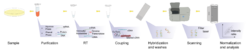 - The labeled product is generated via reverse transcription and followed by an optional PCR amplification. The RNA is reverse transcribed with either polyT primers (which amplify only mRNA) or random primers (which amplify all RNA, most of which is rRNA). miRNA microarrays ligate an oligonucleotide to the purified small RNA (isolated with a fractionator), which is then reverse transcribed and amplified.