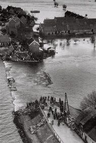 A breach in a levee in Papendrecht, the Netherlands, during the North Sea flood of 1953, flooding houses that had been built behind it